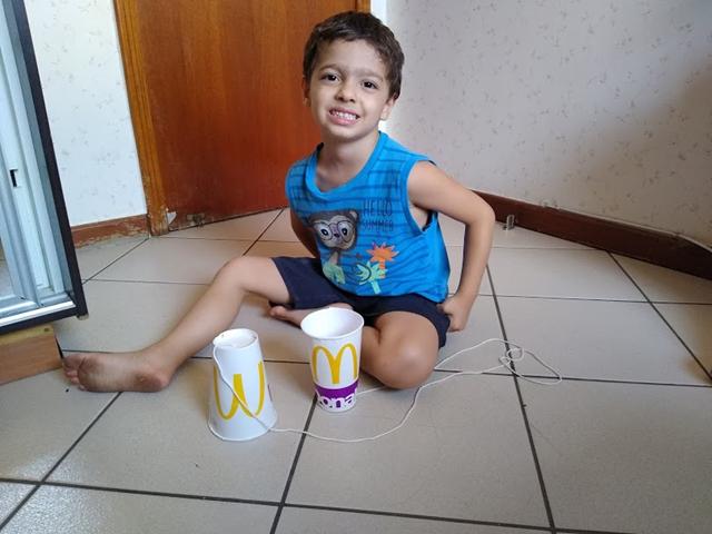 Agora é só chamar um amigo, ou até mesmo a mamãe. Cada um fica com um copo e estica bem o barbante. Assim, mesmo longe um do outro, vocês vão conseguir escutar o que estão falando, mesmo que seja um sussurro!!! Boa diversão!