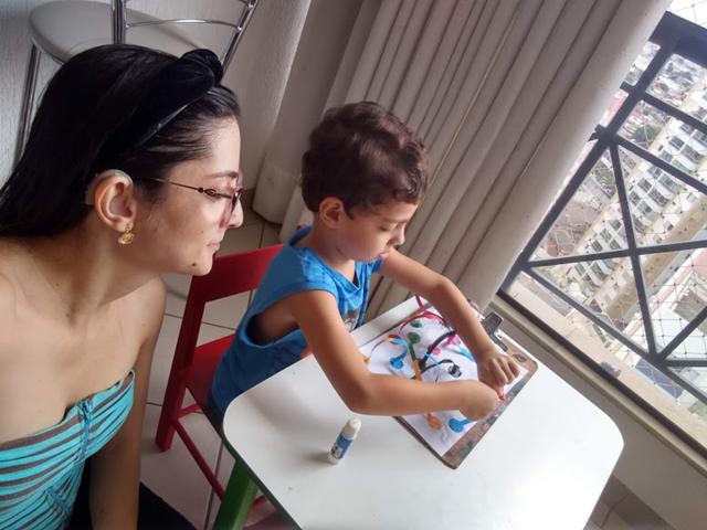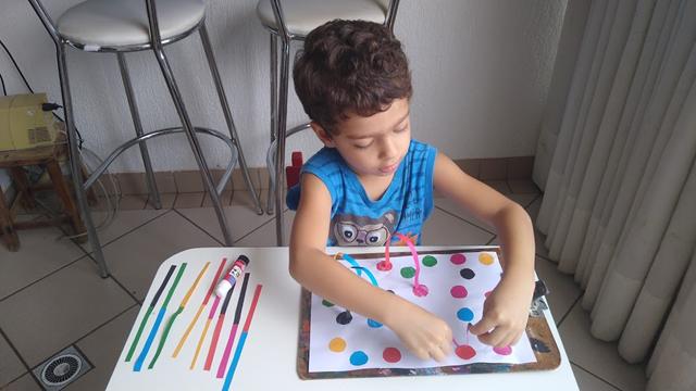 Eu desenhei um círculo como moeda no papel colorido e colei no papel. Depois, eu cortei o papel colorido com a régua e cortei ao meio. Para colar um ao outro em cores diferentes. Disponibilizei a cola bastão para o Davi Antonios colar somente na ponta do papel colorido.