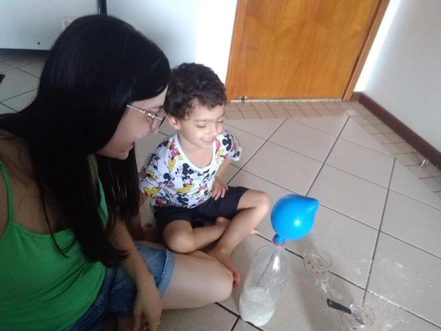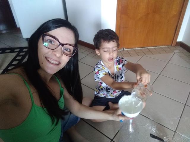 Deitar vinagre para dentro de uma garrafa de gargalo estreito até encher cerca de um quarto da mesma. Com o funil, deitar no balão um pouco de bicarbonato de sódio. Enfiar o gargalo do balão no gargalo da garrafa. Levantar o balão de modo a que o bicarbonato de sódio caia para dentro da garrafa. O vinagre começa a fazer bolhas e o balão começa a encher devagarinho. Davi Antonios gostou bastante. #maeemdia #brincarjunto #tempojunto #maternidadereal #maternidadeativaeconsciente #educandocomamor #DaviAntonioscom4anose3meses