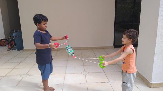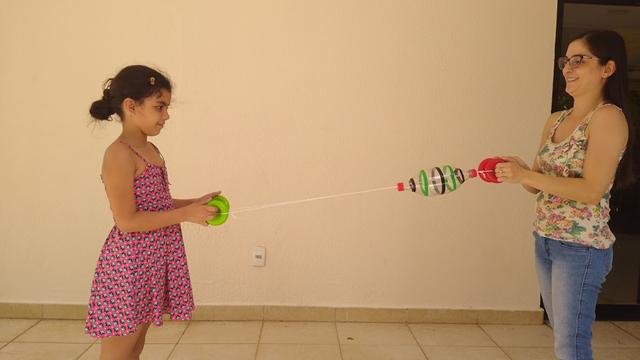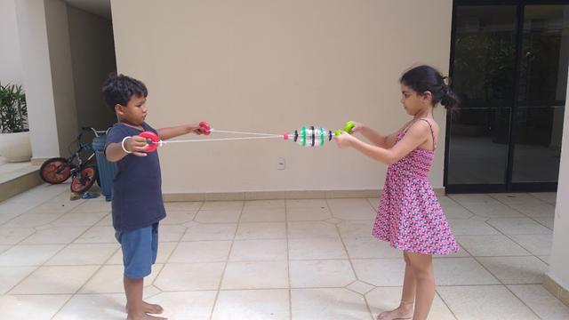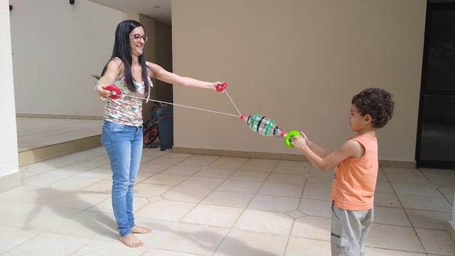 Corte com a tesoura 1/3 da garrafa pet a partir do fundo (um pouco mais que o meio da garrafa). Use as partes de cima que sobraram das garrafas para fazer o “vai e vem”. Encaixe-as uma na outra deixando os gargalos voltados para o lado de fora e passe fita adesiva no meio para juntar as partes. Pegue os fios de cru e corte dois pedaços iguais de aproximadamente dois metros – varia de acordo com o tamanho do braço da criança. Passe ambos por dentro das garrafas coladas e amarre cada ponta com uma ou duas argolas coloridas.