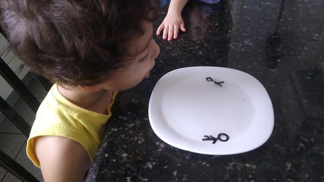 Primeiramente, pegue um prato de vidro. Depois, com o marcador, faça um desenho simples, como o boneco de palito. Em seguida, aplique gentilmente uma pequena quantidade de água sobre os rabiscos. Você verá que o desenho lentamente irá se levantar até a superfície da bolha de água, e pelo movimento dela começará a balançar dentro dos limites.