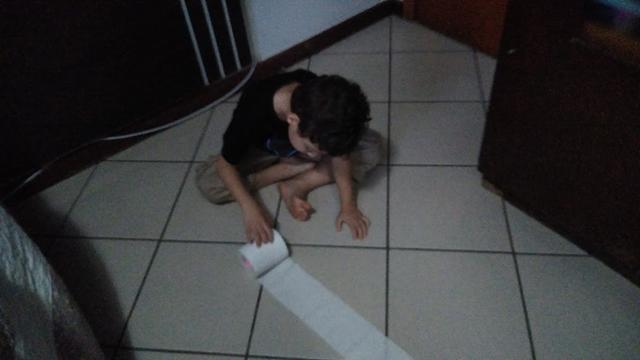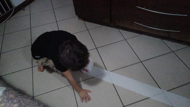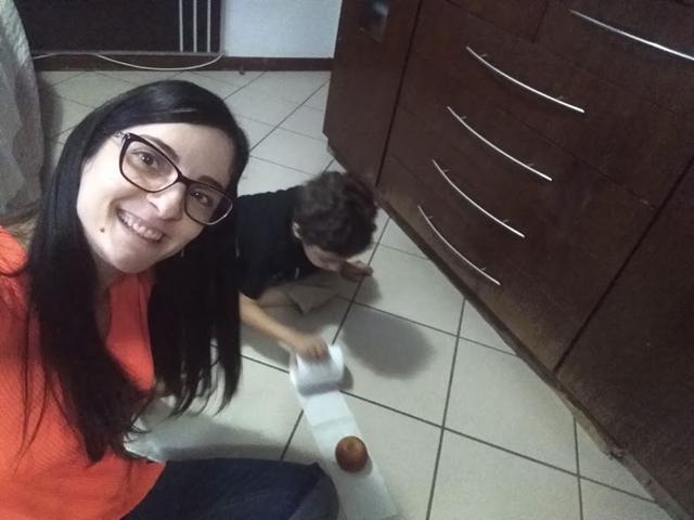 Essa atividade trabalha a coordenação motora da criança que precisa enrolar o papel higiênico puxando a maça pra sua direção. Coloquei uma fita (mas não é necessário), apenas pra ele saber até onde teria que puxar a maça.