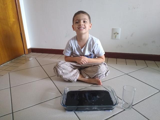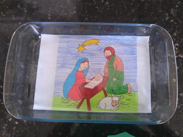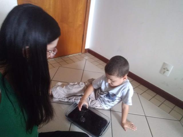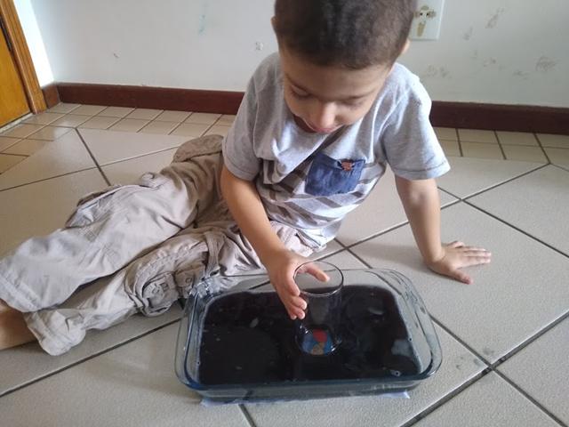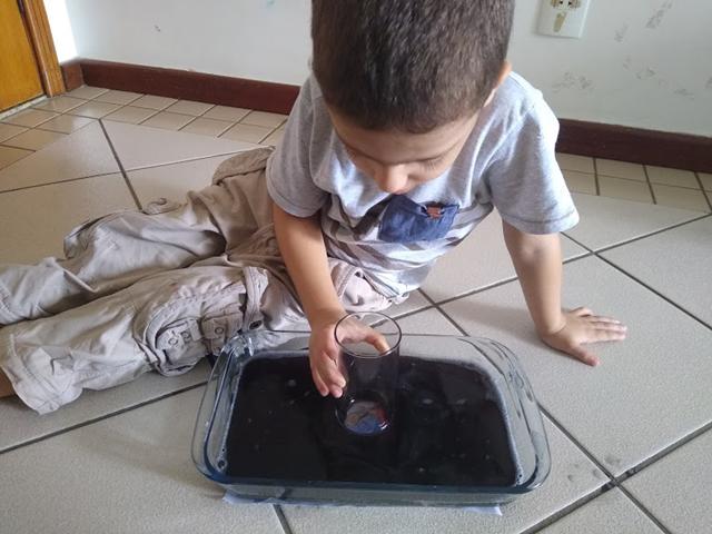 Usei vasilha e copo de vidro. Imprimi as imagens e pintei. Coloquei debaixo da vasilha (aconselho passar fita adesiva na folha para a brincadeira render por mais tempo).