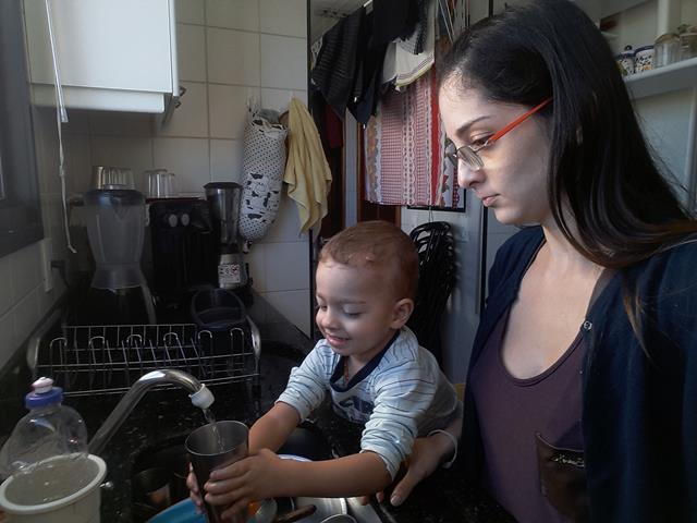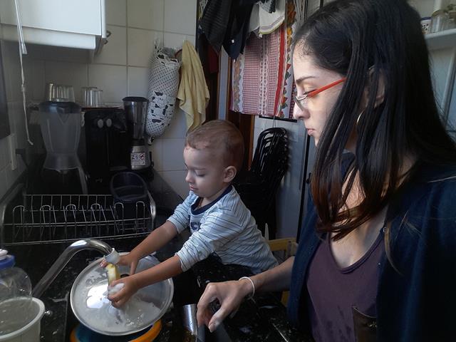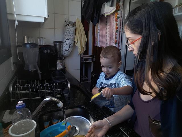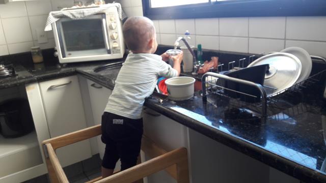Bom diiiia Meus Amores?! Hoje meu ajudante na cozinha, mais que especial, escolheu lavar a louça... Davi Antonios sempre ficava irritado quando eu lavava louça. Quando estou em casa, ele quer a minha atenção o tempo todo, mesmo rsrs. Ele fica agarrado a minha perna reclamando, chega a se enfiar entre eu e a pia para conseguir com que eu parasse. Na cabeça dele não faz sentido que a mamãe tem que fazer algo que não o inclui e ele precisa ficar lá em baixo no chão esperando... Comecei instintivamente a colocá-lo numa cadeira ao meu lado para que ele pudesse ver e participar do que eu estava fazendo. Ele amou desde o primeiro momento quando tinha 1 ano e 8 meses! Ficar na mesma altura que os adultos da casa, brincar de lavar louça também, mexer com a água, descobrir o que de tão legal minha família faz na pia.