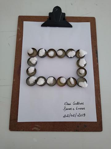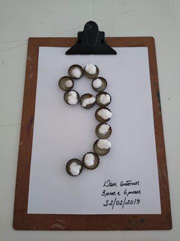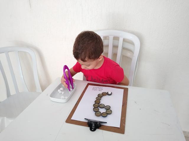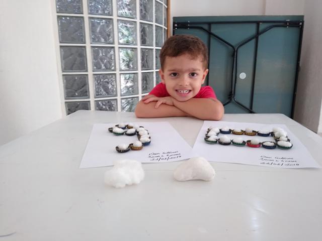 Primeiro objetivo: Montei o número 9 e forma geométrica retângulo com tampinhas de cerveja. Davi Antonios fez transferência de pompons com pinça jacaré e pinça jumbo da cor branca. Mamãe pediu para o Davi Antonios identificar o que é macio e duro (algodão e pedra).