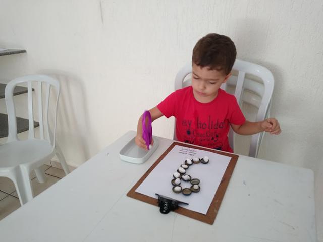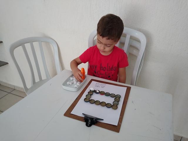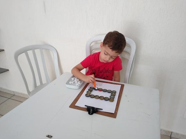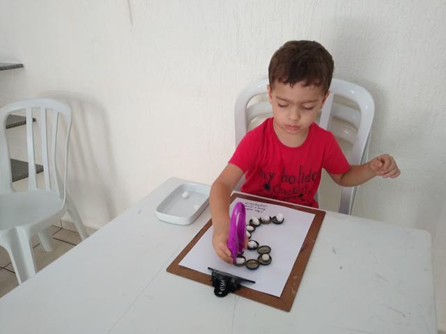 Ele ficou muito tempo nessa atividade, super concentrado e envolvido. Ele fez direitinho! Essa atividade é sempre sucesso por aqui!