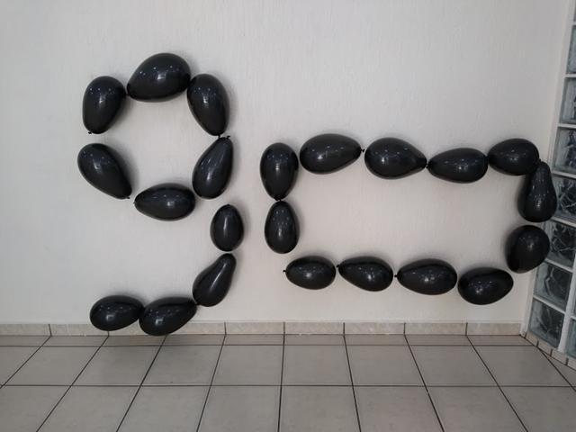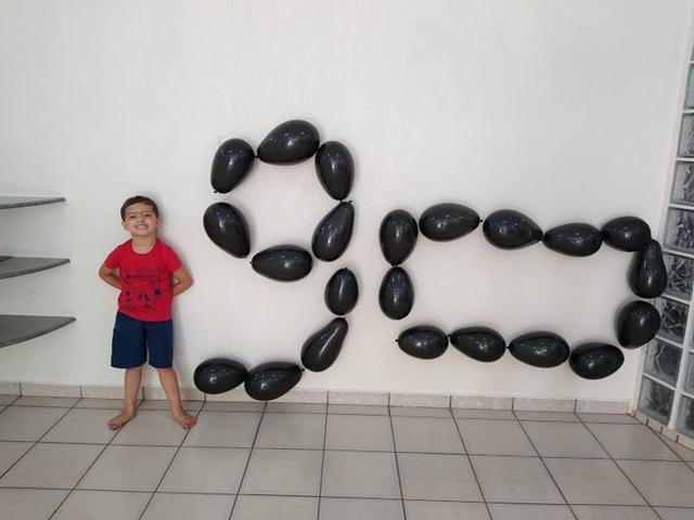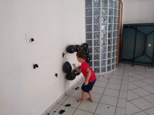 Segundo objetivo: Enchi a bexiga o contorno do número 9 e forma geométrica retângulo da cor preta e colei com fita durex na parede. A mamãe pediu para o Davi Antonios furar com palito de dente.