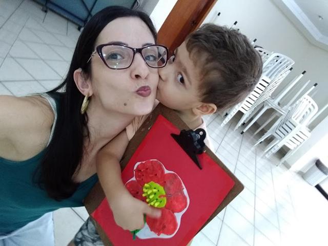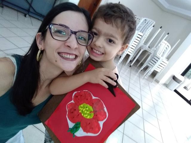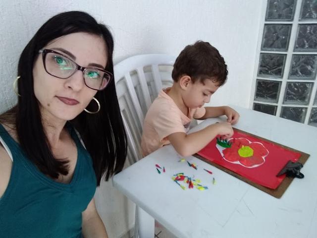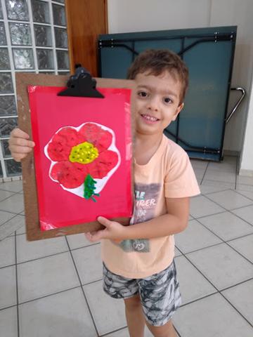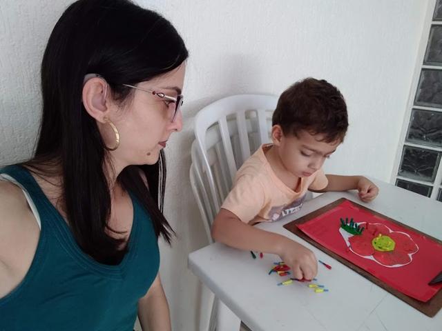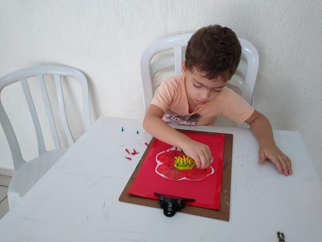 A mamãe imprimiu a flor, amassou com a massinha de modelar de cores diferentes (amarelo, vermelho e verde) e fez os buraquinhos.