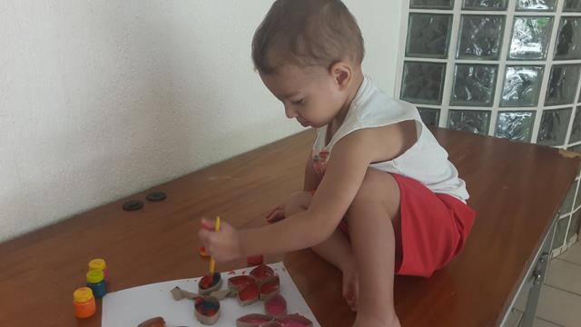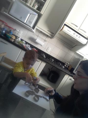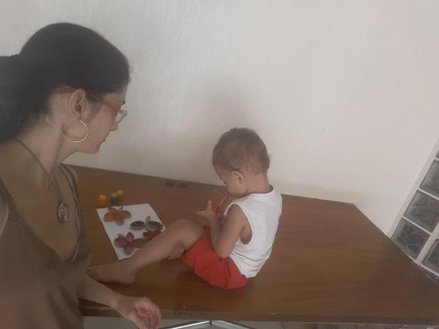 A mamãe sentou em rodinha junto com o Davi Antonios e falou: “Os meus pezinhos juntos estão, cruzo os dedinhos da minha mão, abaixo a cabeça com atenção e fecho os olhinhos em oração... Obrigada, Deus, pelas coisas lindas que o Senhor fez... as cores, as plantinhas e as flores. Amém”.