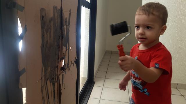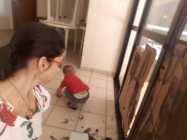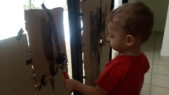 A mamãe colocou o papelão na parede como azulejos. Em uma destas atividades, a mamãe disponibilizou o rolo de espuma e uma tinta preta para que o meu pequeno pudesse se expressar através da pintura. Pintar a parede de azulejos, precisa de olhar atento, precisa de adultos que se deixam “convocar”. SENSAÇÕES, CORPOREIDADE, MOVIMENTO, EXPERIMENTO! As imagens falam muito! Esse momento se torna prazeroso, pois desperta a criatividade, desenvolve a socialização, expõe sentimentos e aprimora traçados. Davi Antonios amou a experiência em pintar em uma superfície vertical com a mamãe. #maeemdia #brincarjunto #tempojunto #maternidadereal #maternidadeativaeconsciente #educandocomamor #DaviAntonioscom1anoe11meses