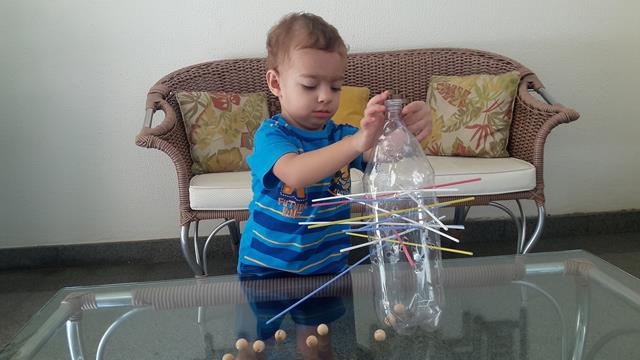 Hoje, de manhã, a mamãe preparou uma atividade super simples. A mamãe fez vários furinhos em volta da garrafa PET e os canudinhos devem ser dispostos nos furinhos da garrafa. O objetivo era encaixar o canudinho na garrafa. Davi encaixou 2 com uma certa dificuldade e preferiu tirar os canudinhos da garrafa. Eu demonstrei como fazia e não me importo se ele preferir brincar de outro jeito. Eu respeito! Ele interessou em jogar as bolinhas de gude dentro da garrafa. Dia frio, bom para atividades calminhas e sem sujeira. Tão simples! Davi brincou por um bom tempo nessa atividade. #maeemdia #brincarjunto #tempojunto #maternidadereal #maternidadeativaeconsciente #educandocomamor #DaviAntonioscom1anoe11meses